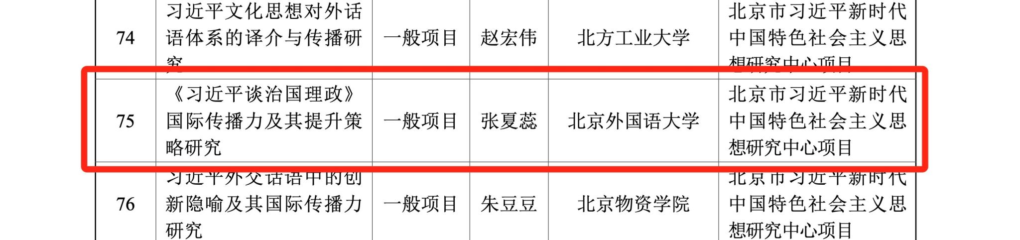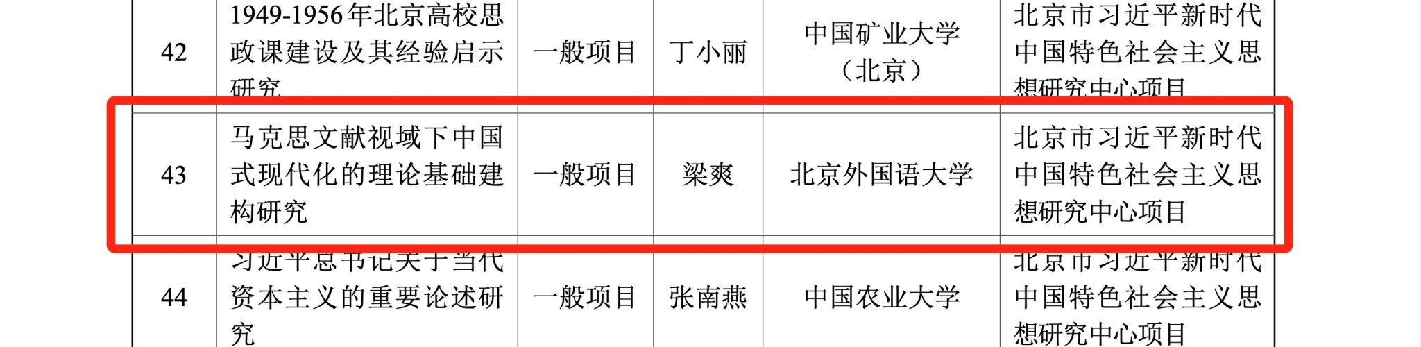 近日,北京市社会科学界联合会、北京市哲学社会科学规划办公室对于批准立项的2024年北京市社会科学基金项目进行了公示,公司教师梁爽主持的“马克思文献视域下中国式现代化的理论基础建构研究”、张夏蕊主持的“《习近平谈治国理政》国际传播力及其提升策略研究”获得立项。