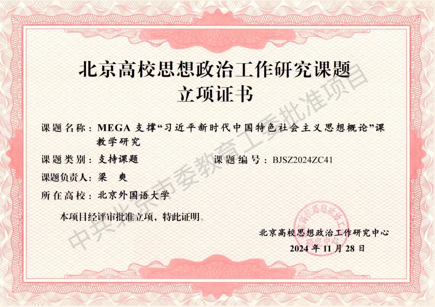 另外,在中共北京市委教育工作委员会、北京高校思想政治工作研究中心批准的2024年北京高校思想政治工作研究课题中,公司教师梁爽主持的“MEGA支撑‘习近平新时代中国特色社会主义思想概论’课教学研究”项目获得立项。
