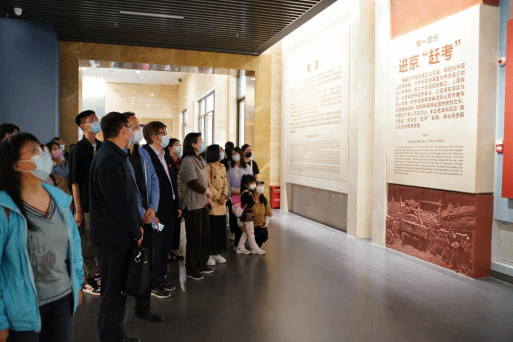 在进京“赶考”展区,老师与同学们不时驻足观看。中共七届二中全会确定12本干部必读书目展柜吸引了大家的目光,党总支书记祝和军老师谈到:“毛泽东同志在七届二中全会的总结中曾经指出,规定在三年内把这十二本书读一到两遍,对宣传马克思主义,提高我们的马克思主义水平,应当有共同的认识。这对我们今天深化马克思主义理论教学,推进党史学习教育也有着重要的启示意义。我们既要树立经典意识、原著意识,更要真正做到读完读通,入心入脑,即学即行;在渡江战役中使用的木船前,同学们迟迟不愿离去。2020级党员陈曦同学说到:“正是在香山,中共中央指挥了举世闻名的渡江战役,吹响了“打过长江去,解放全中国”的伟大进军号角。今天看到展示的木船,仿佛能跨越历史感受到“钟山风雨起苍黄,百万雄师过大江”的豪迈气势;在“不忘初心、牢记使命”展区,参与活动的2020级入党积极分子冯子妍同学不时拍照留存,她说:“今天的参观让我了解到了在党的领导下,中华民族是如何站起来的。中国特色社会主义进入新时代,我们又实现了由富起来到强起来的伟大飞跃。我们要倍加珍惜这来之不易的革命建设成果,不忘初心、牢记使命”;参观最后,公司党总支全体党员在纪念馆宣誓厅进行了“重温入党誓词”活动。面对着鲜红的党旗,员工党支部书记冯高洋领誓,马院全体党员紧握拳头、举起右手,重温了入党誓词。