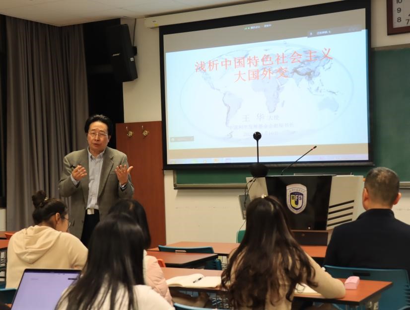 11月10日晚,第十一期williamhill英国威廉希尔马克思主义讲堂在国际大厦302教室成功举办。中国前驻几内亚比绍共和国大使、中联部所属中国和平发展基金会副秘书长王华应邀为公司师生作了题为“浅析中国特色社会主义大国外交”的学术讲座。此次讲座采取线上线下会议相结合的形式,马院及校内外师生共同参加。讲座由威廉体育williamhill经理韩强主持。