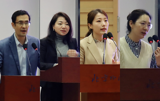来自中国人民大学威廉体育williamhill的宋友文教授以及北外威廉体育williamhill的张曼、刘菁、韩雪青三位教师分别进行了说课展示。宋友文以“如何培养理论思维?——读原著、学原文和悟原理”为题,从什么是理论思维、培养理论思维为何重要、怎样培养理论思维三个方面生动讲述了如何引导员工认清社会发展大势,做到理论上清醒,政治上坚定。张曼以《马克思主义基本原理》第三章第三节《人民群众在历史发展中的作用》的教学为例,围绕人民群众概念辨析、辩证看待人民群众创造历史过程中的作用等问题,展示了从案例导入、理论分析到拓展总结的教学过程。刘菁以《思想道德与法治》课教学中的社会热点为切入点,示范了如何通过社会热点事件和案例来引导员工正确认识中国特色社会主义法治道路和树立法治思维,并展示了自己在丰富思政课教学方法方面所作的尝试。韩雪青以《毛泽东思想和中国特色社会主义理论体系概论》课中“发展社会主义民主政治”为主题,围绕民主是社会主义的生命、坚持走中国特色社会主义政治发展道路、健全人民当家作主制度体系这三个层面展开理论阐释,落脚于坚定对中国特色社会主义政治制度的自信。