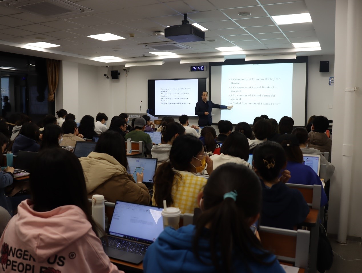 孙有中分别围绕“什么是人类命运共同体”、“全球视角”、“中国在人类命运共同体中的贡献”三个问题展开课堂教学。针对英语专业和翻译学专业同学的学科特点,首先提出问题:“如何翻译人类命运共同体?”并给出不同版本的英文翻译,进一步引导同学们思考:更倾向于选择哪一种翻译,为什么选择这一翻译,引发了同学们的积极思考和互动。