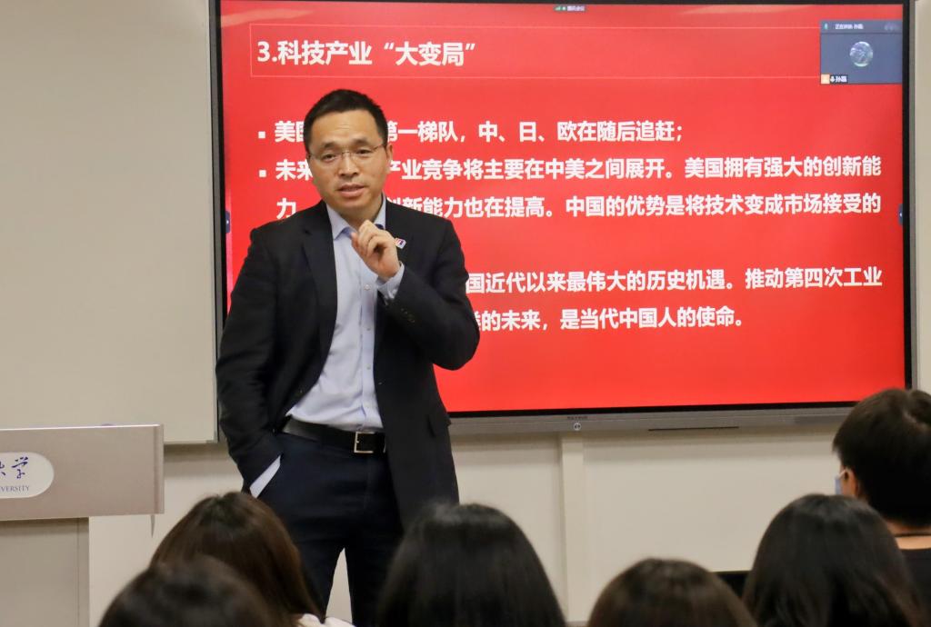 杨丹强调,中国在不断深入参与国际治理体系的过程中,将会在全球治理中发挥越来越重要的作用,推动全球治理体系的变革,成为中国特色大国外交的使命之一。他为同学们生动地讲述了在联合国《生物多样性公约》第十五次缔约方大会谈判中,我国的生态文明理念如何获得与会代表的认可并写入官方文件的案例。并指出,新时代中国特色大国外交所遵循的是人类命运共同体理念,这一理念强调建构真实的、平等的、互利的共同体,它在国家与国家之间建立的是一种平行结构的伙伴关系,而不是中心—边缘结构的资本主义剥削链条关系,鲜明地体现了中国特色社会主义的价值观念。