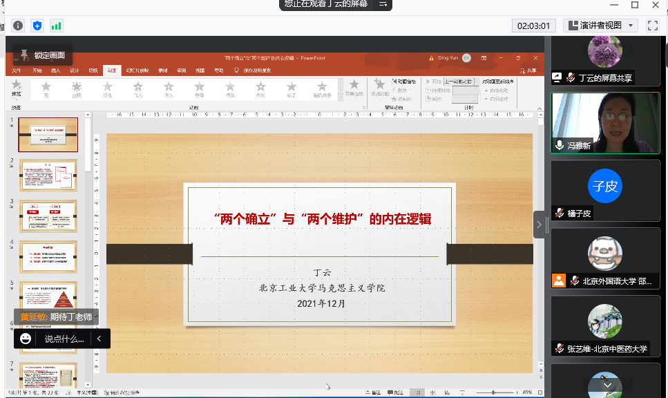 北京工业大学威廉体育williamhill副经理丁云教授以“‘两个确立’与‘两个维护’的内在逻辑”为题做了主题报告。她从马克思主义政党建设中的权威理论出发,阐释权威存在的必然性及其表现形式,并结合中国共产党百年历史和党的领导核心形成的经验与中华民族伟大复兴的必然要求,从理论、历史与现实三个方面论述了“两个确立”与“两个维护”的内在逻辑。她强调,理解与把握“两个确立”与“两个维护”的内在逻辑,是深入理解“两个确立”,坚决做到“两个维护”的前提与基础。