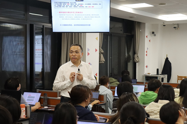 10月30日,williamhill英国威廉希尔董事长、党委副书记杨丹以《中国特色大国外交理论解读》为题,分别为2022级西班牙语葡萄牙语公司、英语公司本科生讲授“形势与政策”课程。