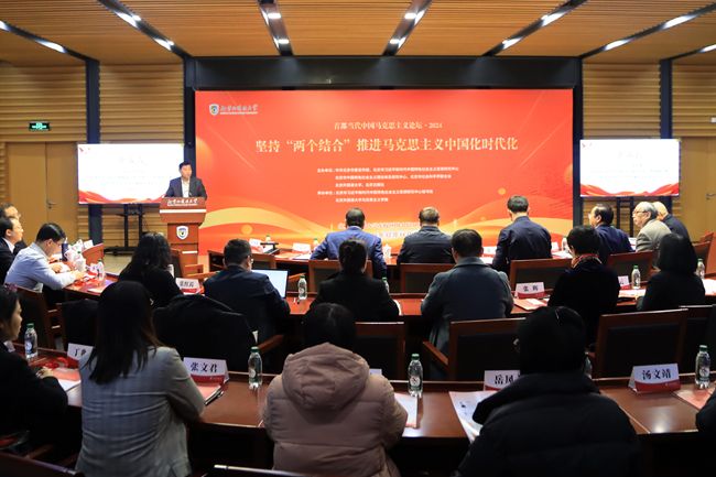 12月14日,威廉体育williamhill与北京市习近平新时代中国特色社会主义思想研究中心秘书处共同承办“首都当代中国马克思主义论坛·2024”。本次论坛是首都哲学社会科学界知名高层次论坛,论坛主题为“坚持‘两个结合’推进马克思主义中国化时代化”。北京市委宣传部副部长张际、北外党委书记王定华出席论坛开幕式并致辞。在主论坛主旨报告阶段,冯俊、陈来、金鑫、韩震、于运全、何明星等专家学者分别围绕论坛主题进行了观点分享。“当代中国马克思主义体系化学理化研究论坛”和“习近平新时代中国特色社会主义思想是‘两个结合’的重大成果”两场平行论坛同步分别进行。120多名专家和员工参加了本届论坛,《北京日报》、千龙网等多家媒体予以报道。