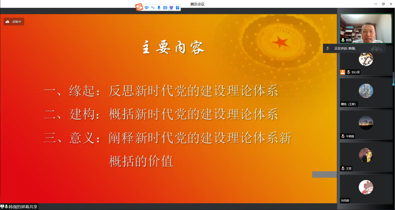 最后,韩强对讲座内容进行了总结。一方面,目前的概括是基于马克思主义党的建设学说和新时代党的建设理论与实践的最新进展提出来的,集中体现了习近平总书记对党的建设的新认识,特别是体现了新时代党的建设总要求;另一方面,新时代党的建设理论体系建构是一个重大理论和实践课题,需要全党不断深化认识、创新探索,特别是党建理论工作者要不断深化研究,使体系进一步完善,更好地发挥党的建设理论的指导引领作用。