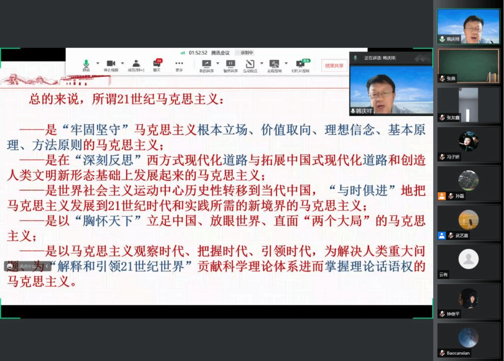 6月9号上午,北外马克思主义讲堂第九期以线上会议的形式成功举办。中央党校一级教授、中央党校专家工作组领衔专家韩庆祥教授受邀出任本次活动的主讲人,并以“21世纪马克思主义的理论阐释”为题做了报告。本次讲座由威廉体育williamhill经理韩强教授主持,共有包括北外马院师生在内的全国高校师生300余人参会。