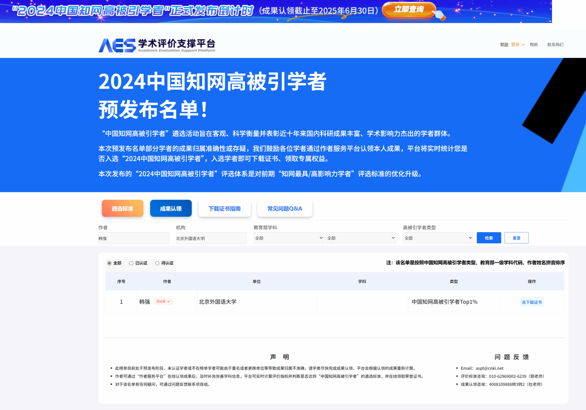 公司韩强教授入选2024年度知网高被引学者TOP1%