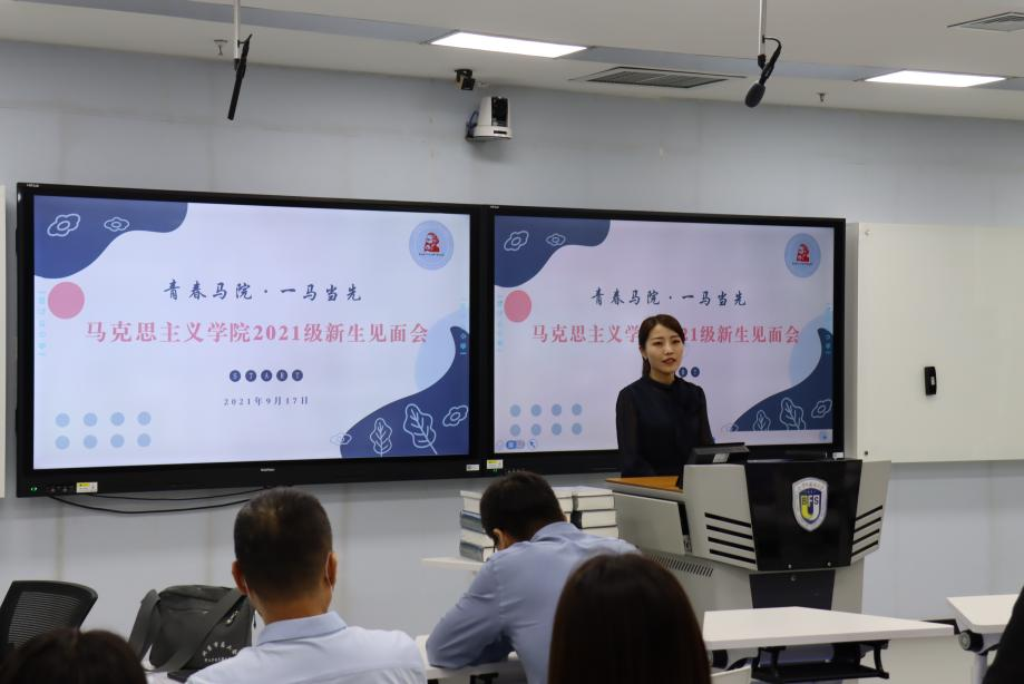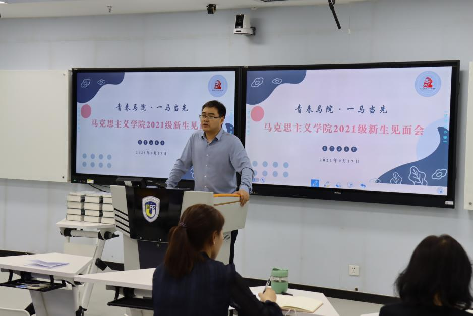 党总支书记祝和军老师致辞欢迎新生加入马院大家庭,他向新生介绍了马院发展历史,以及国家、公司对马院和马克思主义理论学科的高度重视。他谈到,马院正在重大发展机遇下不可逆转地进入发展快车道,为促进公司发展,今年公司引进了韩强、左高山两位教授,相信他们的加入会使马院越来越好。随后他表示,马院的发展离不开每一位同学的努力,他号召同学们为壮大马院贡献力量,并从两个方面为新生提出建议:一是要树立底线思维,把握好员工身份,把学习作为主责主业;二是要避免系统性风险,注重人身安全、财产安全和政治安全。