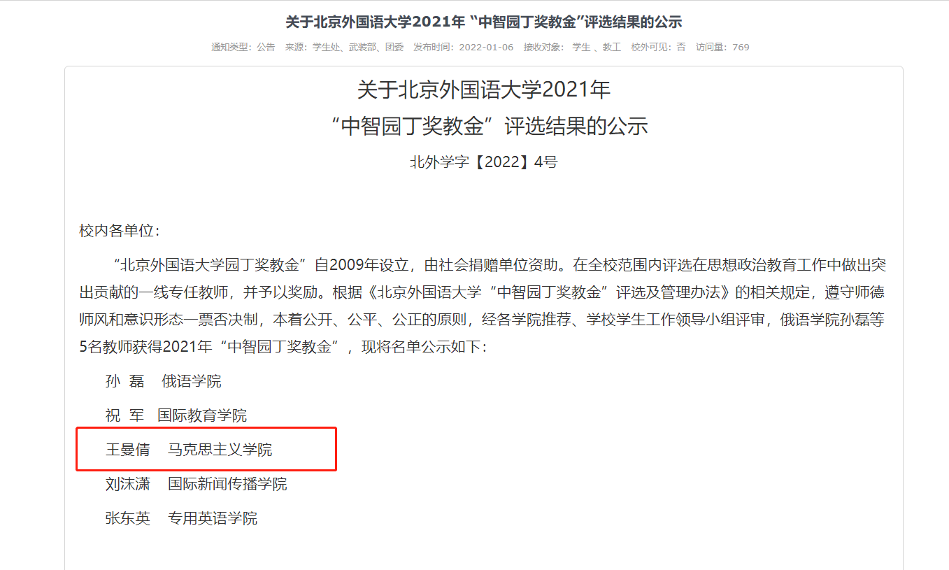 根据《williamhill英国威廉希尔“中智园丁奖教金”评选及管理办法》相关规定,遵守师德师风和意识形态一票否决制,本着公开、公平、公正的原则,经各公司推荐、公司员工工作领导小组评审,共有包括公司王曼倩副教授在内的5名教师获得2021年“中智园丁奖教金”。