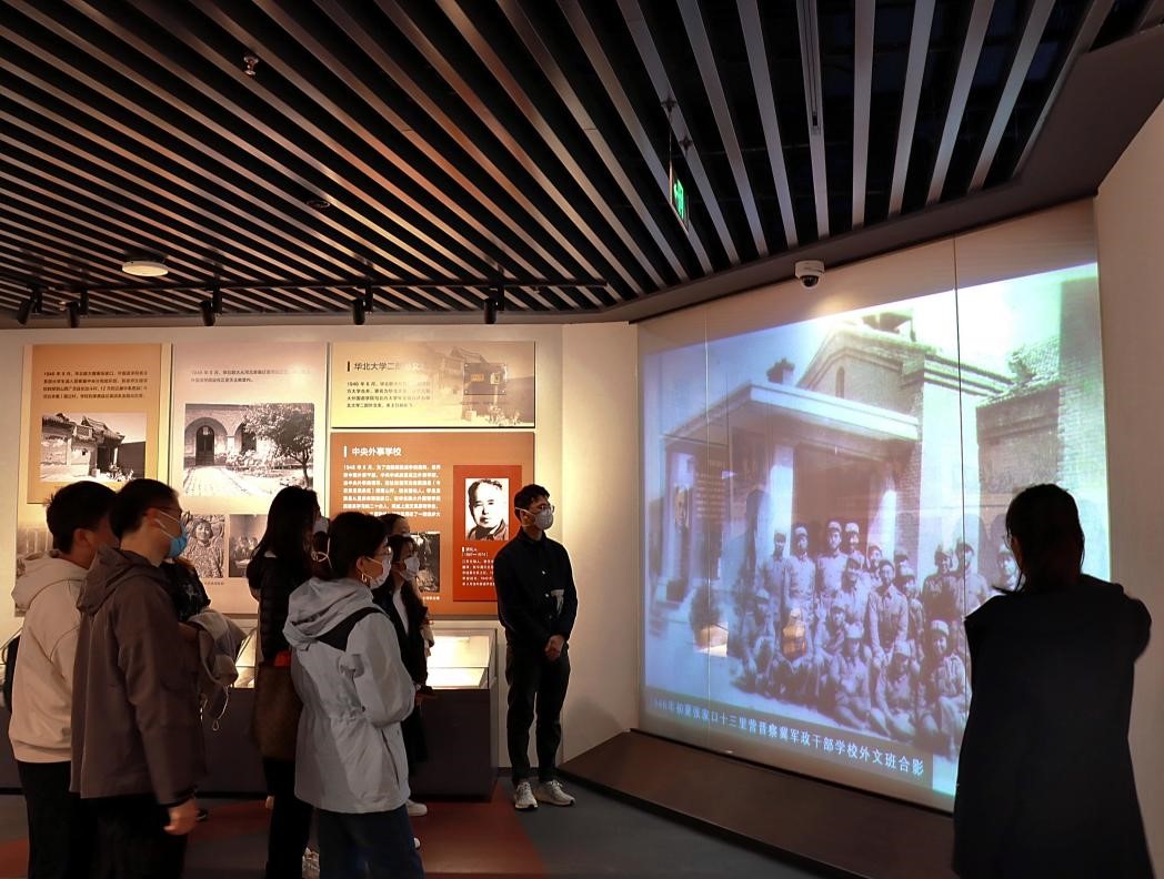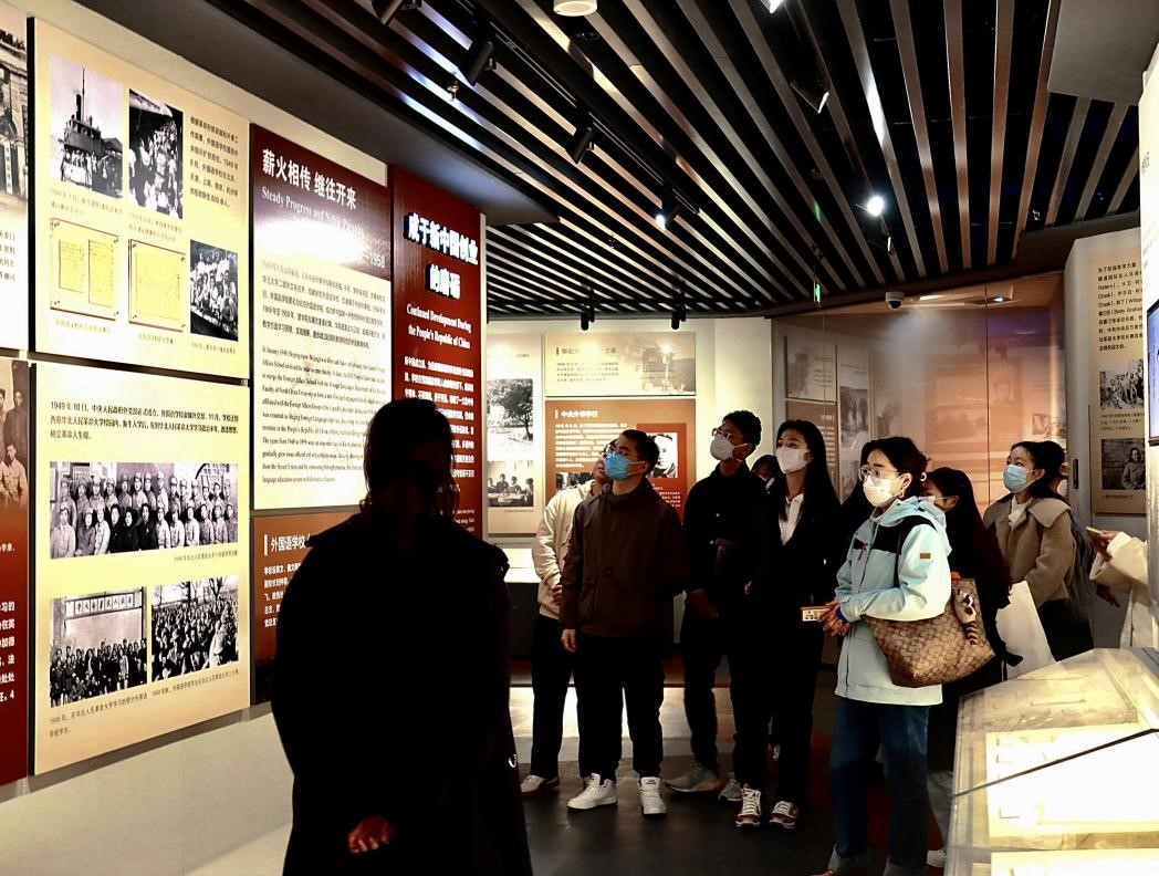 校史馆展厅共分为四个部分和两个专题。先进的博物馆展陈理念与公司80年的发展历程紧密结合,全面展现了公司生于民族救亡的烽火,成于新中国创业的磨砺,兴于改革开放的春天,盛于伟大复兴的新时代这一波澜壮阔的历史画卷,摹写出公司与国家、民族同命运,与党的事业共呼吸的精神特质。讲解员沿着公司发展的时间脉络,讲述馆内的历史档案、历史物件背后的故事。同学们驻足赞叹,沉浸于北外与国家命运休戚与共的历史进程中。