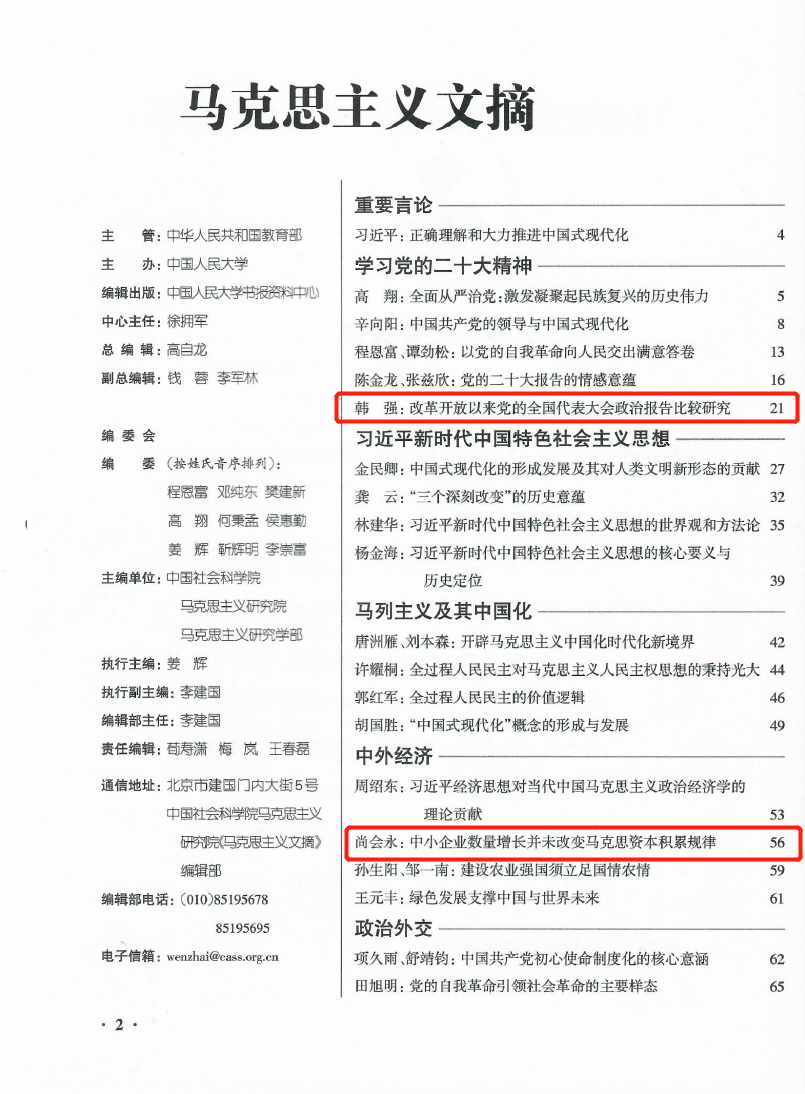 日前,公司韩强、尚会永两位教授文章《改革开放以来党的全国代表大会政治报告比较研究》《中小企业数量增长并未改变马克思资本积累规律》被人大复印资料《马克思主义文摘》(2023年第2期)全文转载。