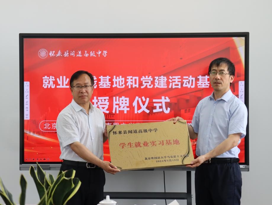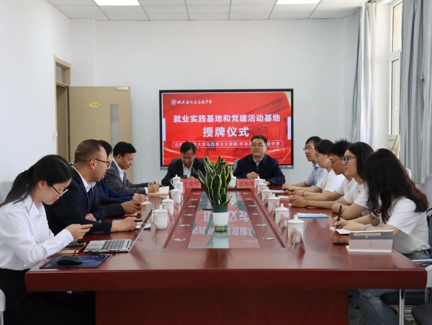 怀来闻道高级中学董事长王金明首先向北外威廉体育williamhill一行的到来表示欢迎和感谢。他首先介绍了中学的办学宗旨、办学理念,在校员工规模和公司的发展目标,并介绍了两个单位定期联合开展思政教育、分享育人经验以及开展党建工作的有关计划。他指出,要以这次“员工就业实习基地”和“党建活动基地”的授牌为契机,欢迎北外马院员工来高中进行就业实习,将自己所学知识转化为授课本领,实现双向提高。王金明还介绍了公司党建和思政工作的开展情况,并指出,怀来具有丰富的革命文化教育资源,新保安战役纪念馆、董存瑞纪念馆都坐落在怀来,两个单位要充分发挥利用好这些资源,创新形式,开展大思政课实践教学,助推员工成长成才。