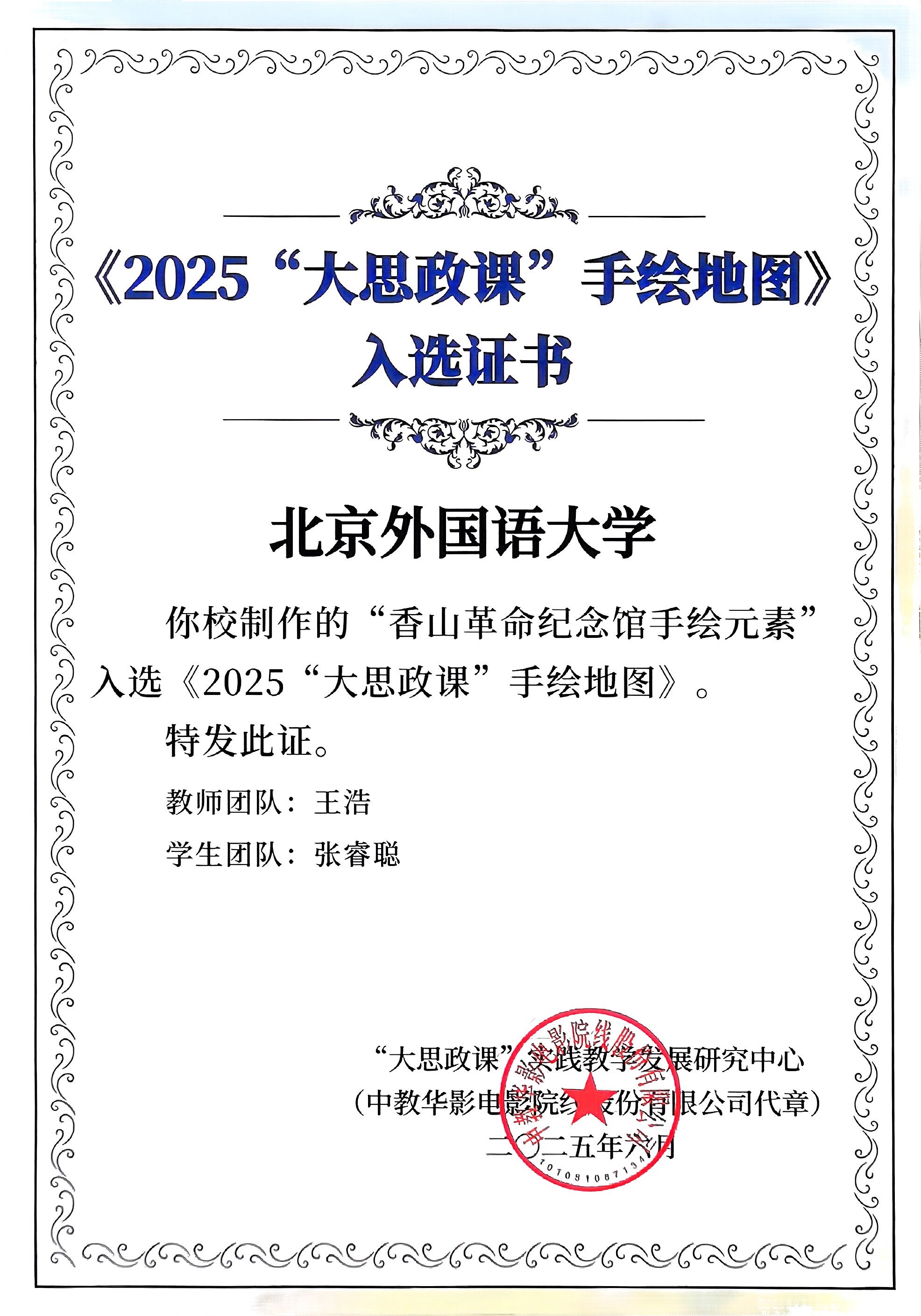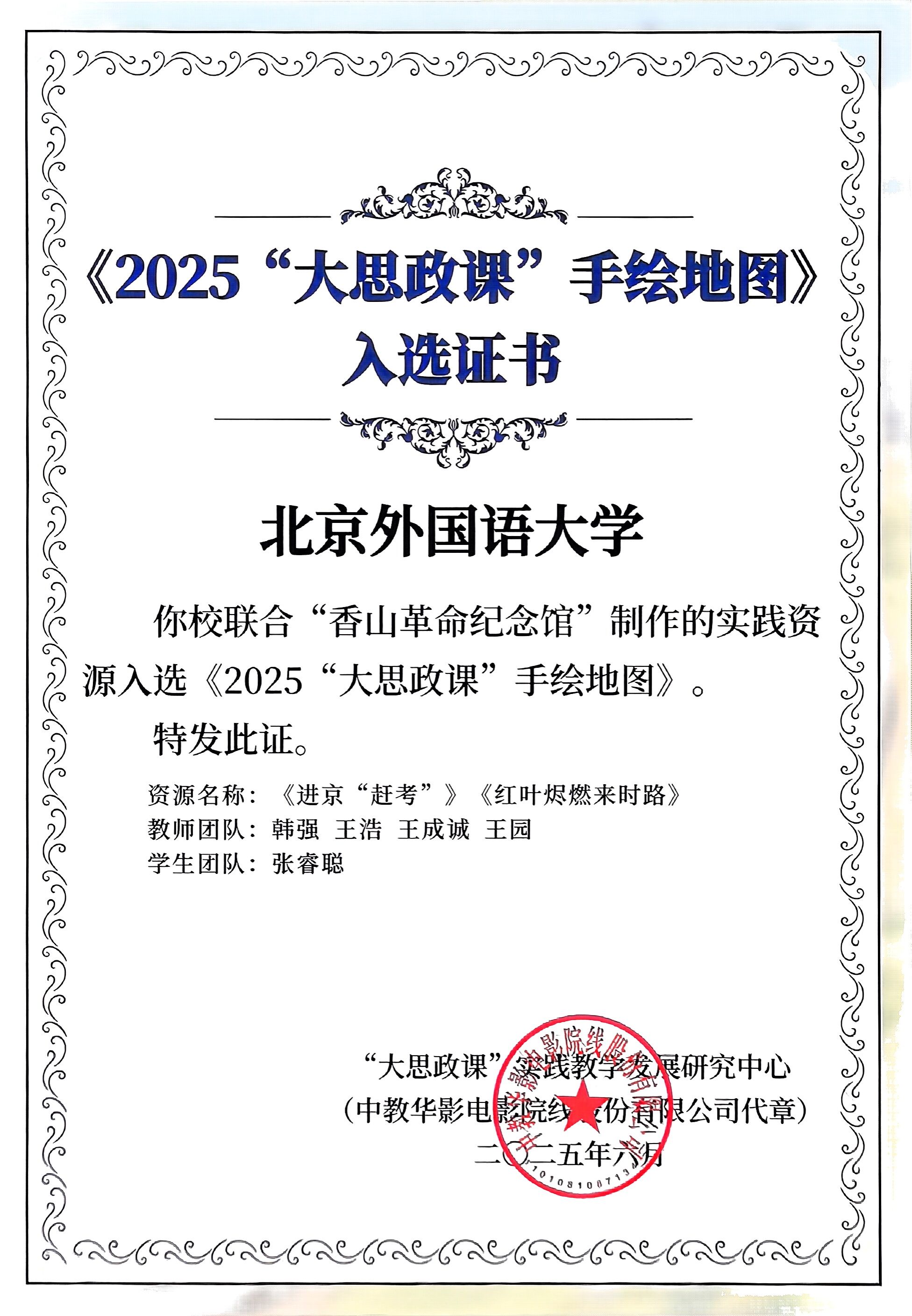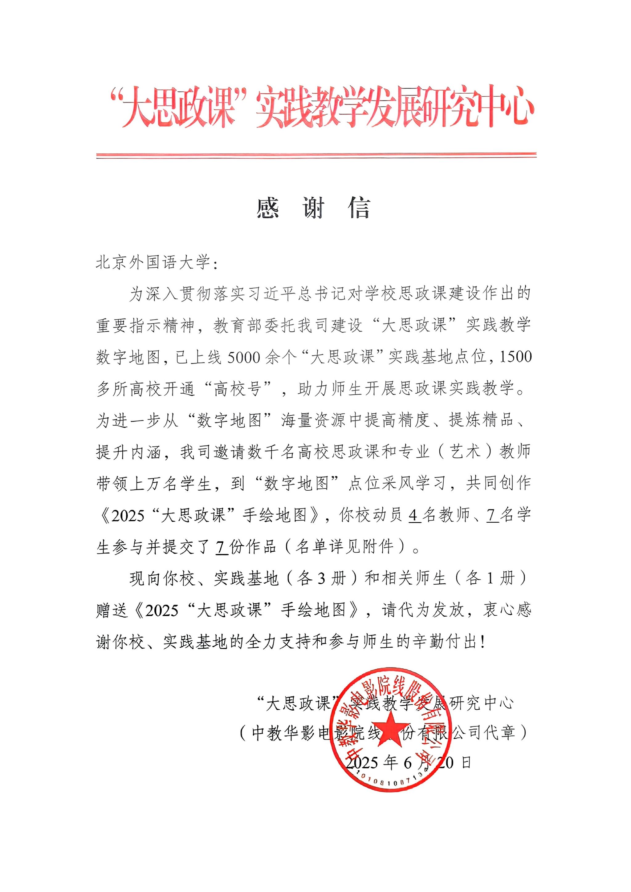 近日,“大思政课”实践教学发展研究中心向公司发来感谢信,对公司师生积极参与教育部委托建设“大思政课实践教学数字地图”项目表示感谢。公司马院教师团队带领来自不同公司的多名同学,通过点位采风,精心创作了7份手绘和视频作品。经专家评审,《香山纪念馆手绘元素》、视频《进京“赶考”》、《红叶烬燃来时路》,成功入选《2025“大思政课”手绘地图》。