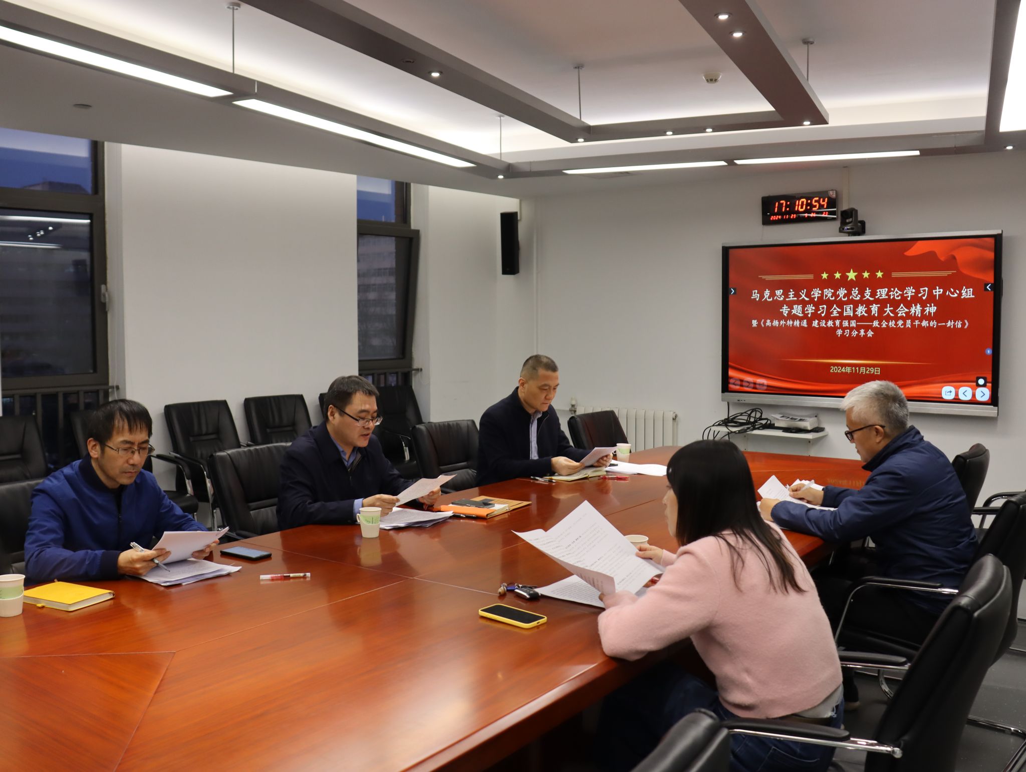 党总支书记祝和军做总结:马院贯彻落实全国教育大会精神,就是要积极融入新时代立德树人工程,牢牢把握思政课的政治属性和用习近平新时代中国特色社会主义思想铸魂育人的时代使命,在公司党委的领导下,推动思政课高质量、内涵式发展,凸显思政课在公司“大思政”格局中的课堂主渠道作用,在公司“三有”人才培养过程中凝聚思政引领力量。公司致全公司党员干部的一封信,集中体现了贯彻全国教育大会精神的北外理念和北外实践,围绕公司工作大局,马院要做贯彻落实的先行军,积极践行的排头兵:一、发挥好各党支部的战斗堡垒作用,把学习贯彻全国教育大会精神,贯彻落实公司发展理念作为一项重要的政治任务抓实抓牢;二、发挥好各教研室的教学共同体的组织功能,推动思政课建设和党的创新理论武装同步推进、把构建以习近平新时代中国特色社会主义思想为核心内容的思政课程体系作为公司工作的重中之重;三、将贯彻落实党的二十届三中全会精神与全国教育大会精神结合起来,以融入公司工作大局为立足点和落脚点,推动体制机制改革,系统把握管理与业务、教学与科研、理论与实践的辩证关系,推动马院各项工作的稳步快速发展。
